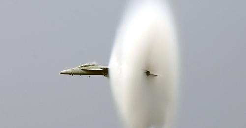 [U.S.Navy fighter jet breaking the sound barrier.]