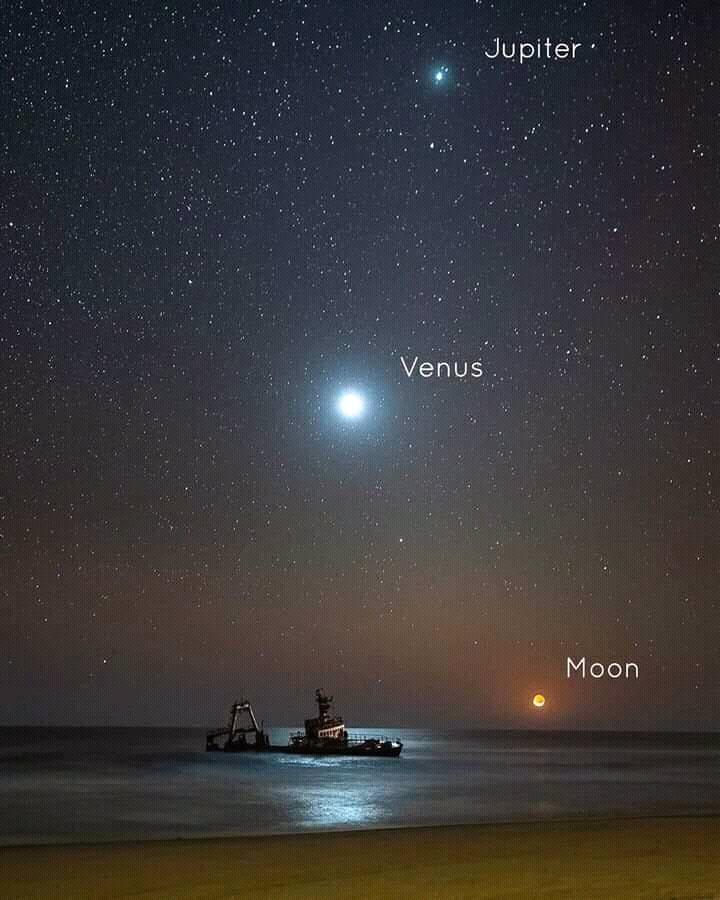 [A single exposure image of the Moon sinking over the horizon as Venus and Jupiter shine over a shipwreck on the Skeleton Coast, Namibia. The trio will soon disappear below the horizon, closely followed by the Milky Way.]