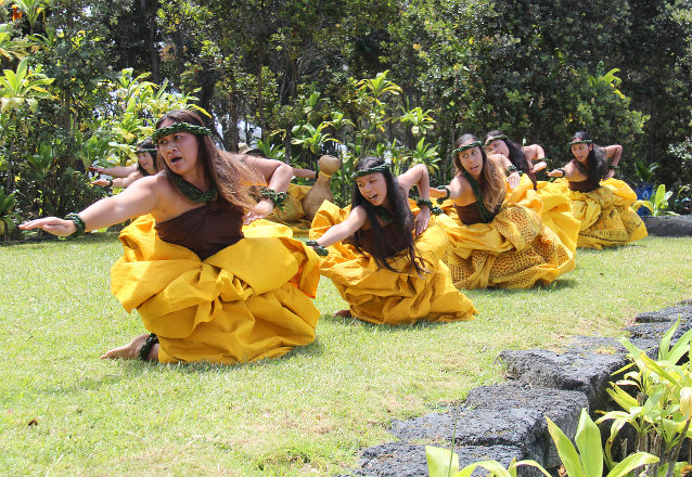 [At the Hawai'i Volcanoes National Park, dancers demonstrate the 'ai ha'a or low bombastic style of hula - Jay Robinson]